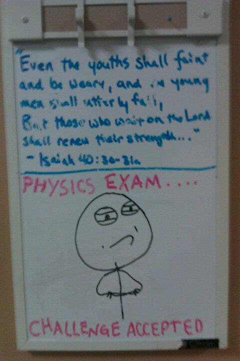 All week I went back and forth between wanting to try to ace the final so someone can make an inspirational movie about me or giving up and screwing physics and forgetting all the people that might want to study with me but focusing on other classes. I'm pretty sure I did a million calculations.