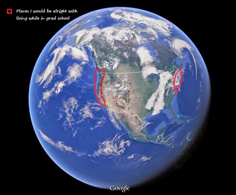I've lived in Colorado my whole life. Colorado is probably the best place in the world, let's just face it. The climate is nearly perfect, although its bipolarness, no tripolarness is annoying. Spoiled in this lovely region, there are some places I cannot bear to live in for two to six years (depending on if I stay for my PhD). Thus began my search.